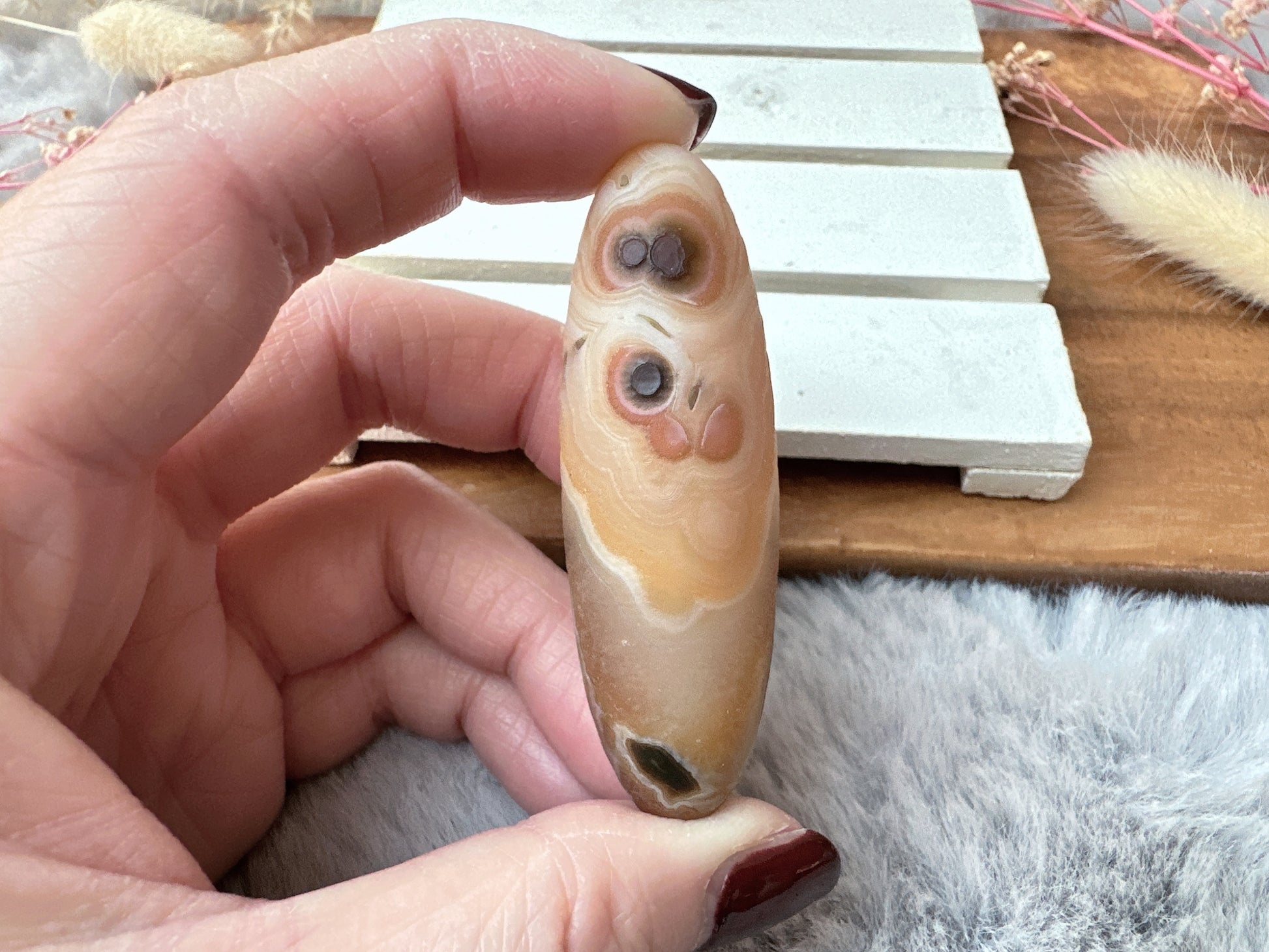 Hand carved stones will not be perfect or symmetrical. Stones in their rough, natural, unpolished state and will include facets and irregularities such as nicks and chips.