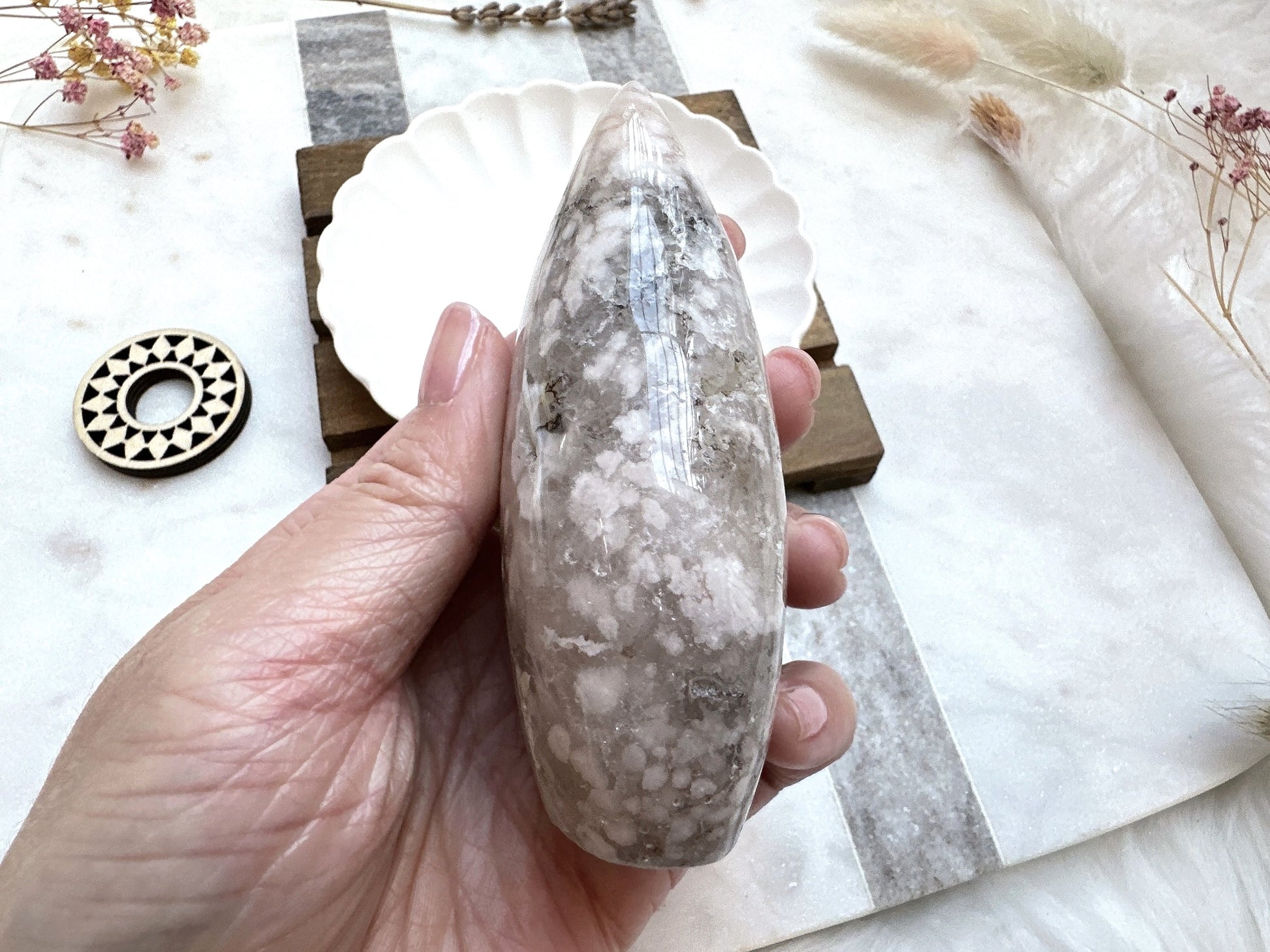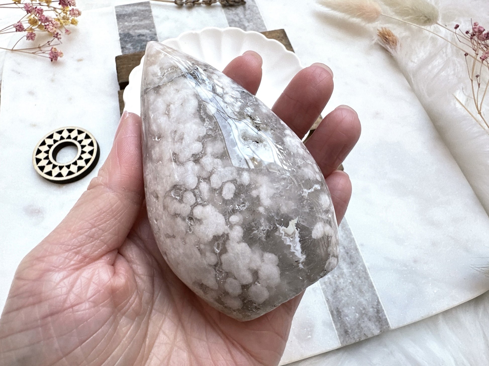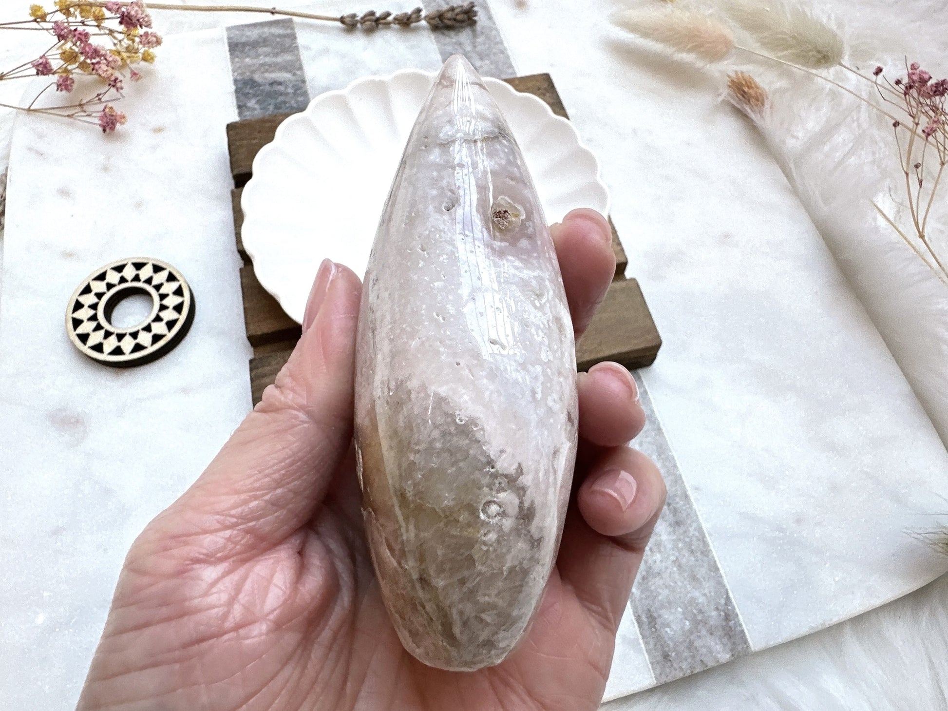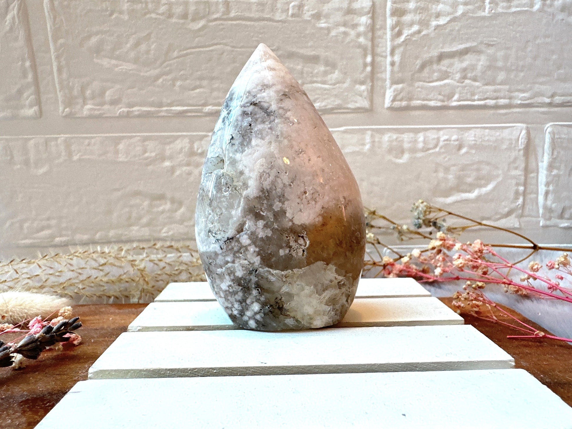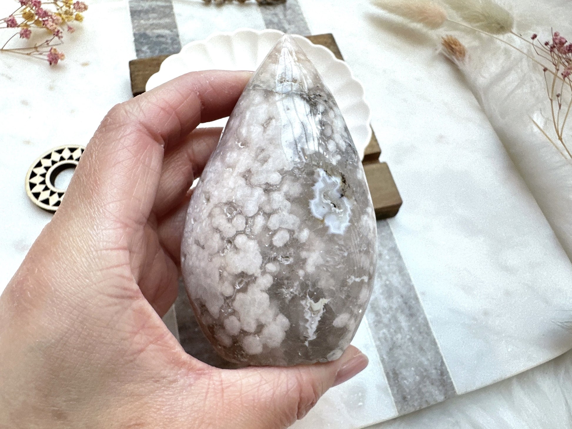 This flower agate flame measures approximately 87x53mm and weighs about 225g.
