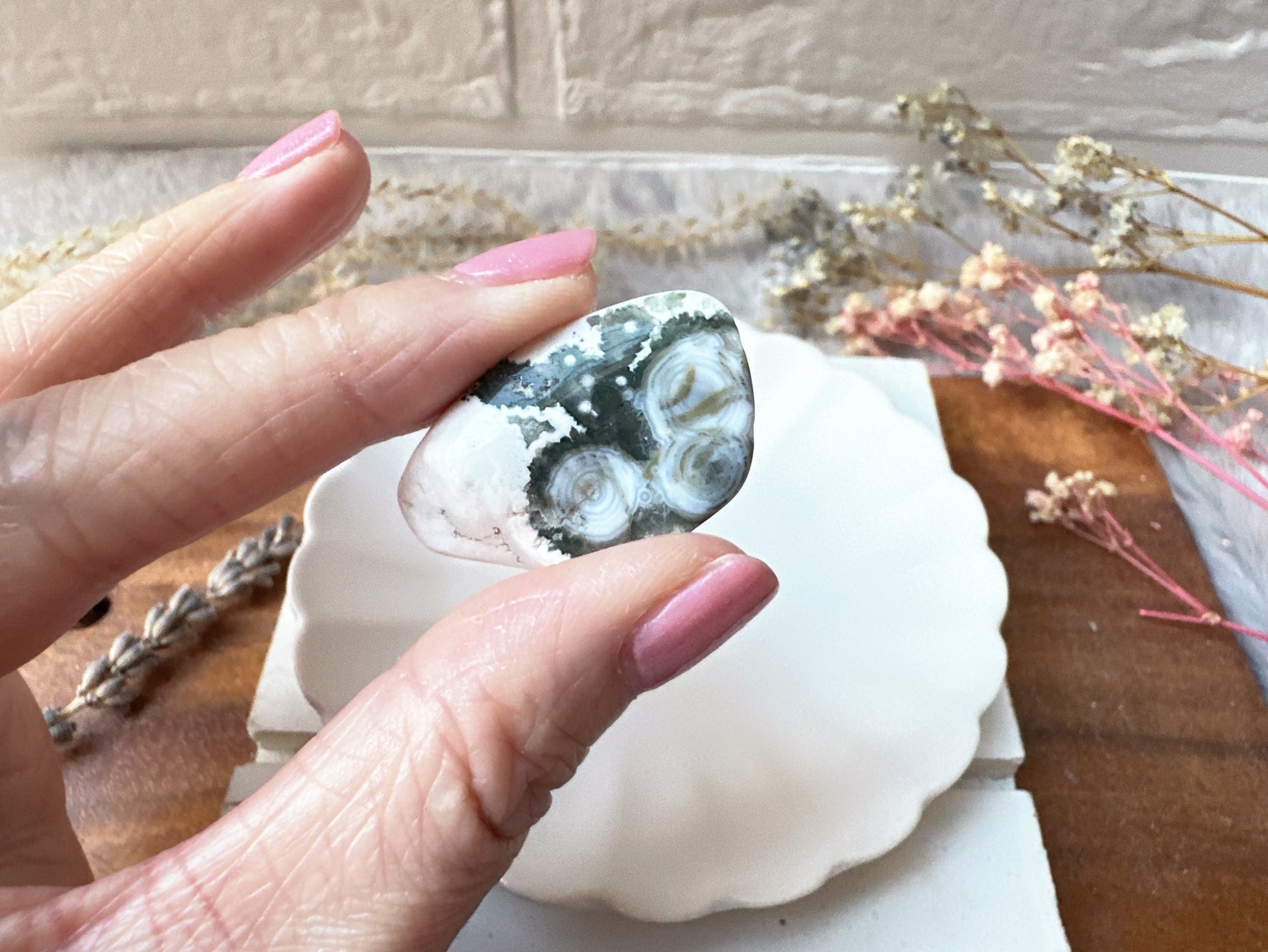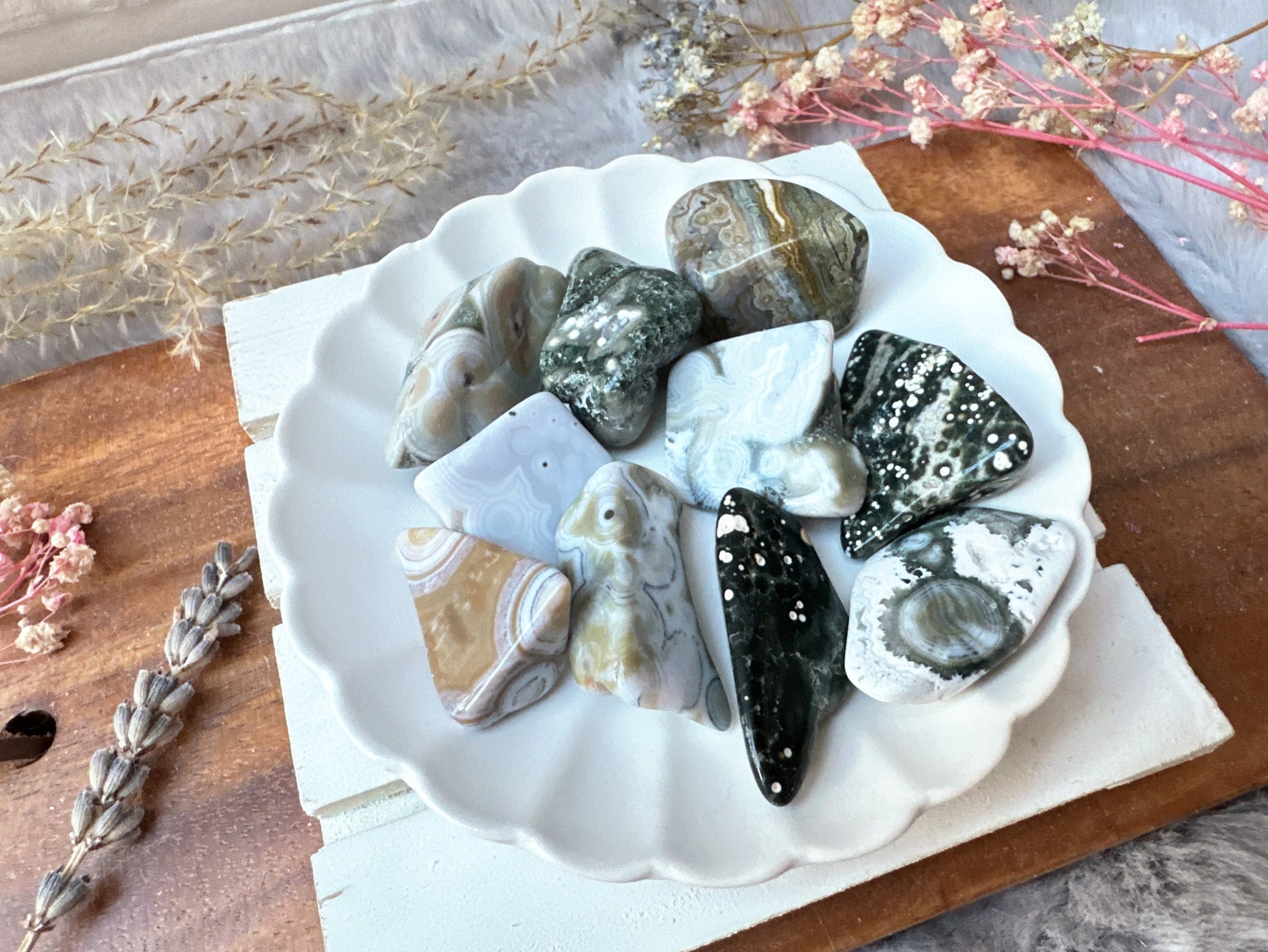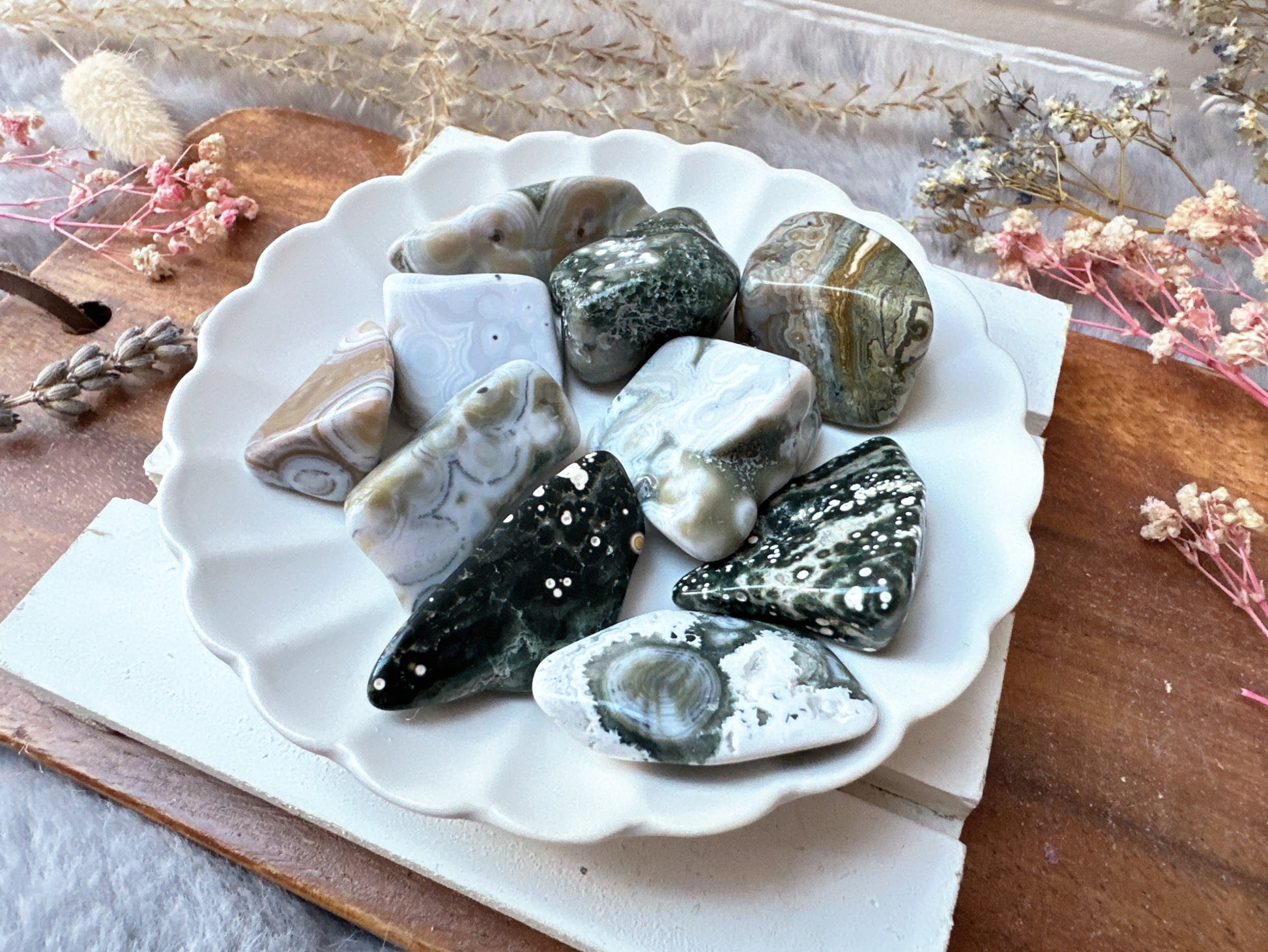 Set of 10 beautiful small ocean jasper tumbles. This listing is for this exact set.